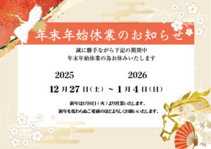 さて、弊社では下記の日程で年末年始お休みさせていただきます。