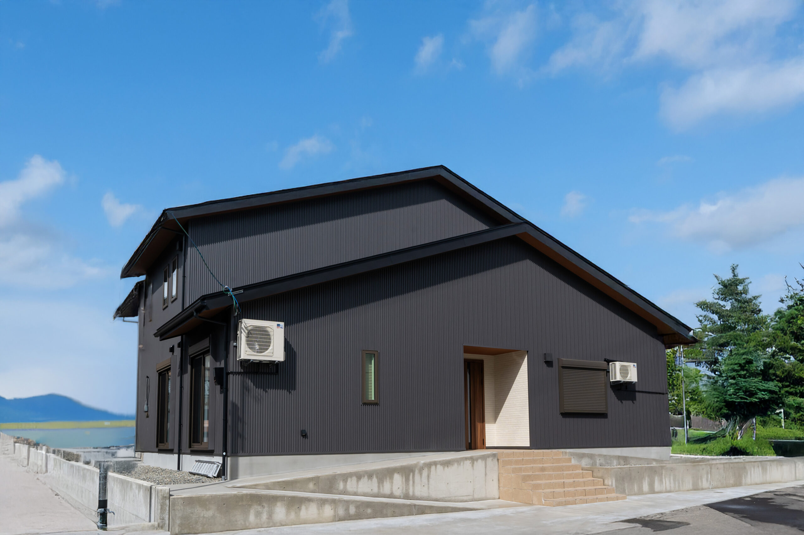外構もスロープがあり、人に優しい設えに。黒の金属サイディングが上品さと落ち着いた雰囲気を醸し出しています。また勝山に「いいお家」が増えました。