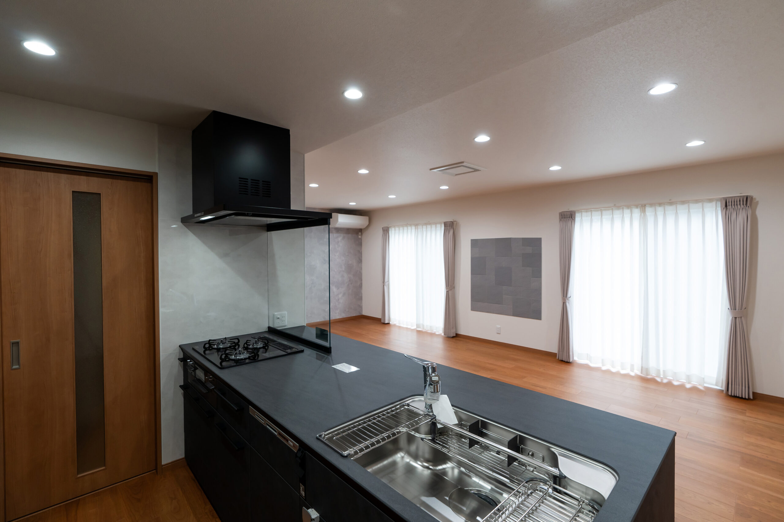 大きな掃き出し窓からは優しい陽射しがLDKを包み込みます。壁に貼られたエコカラットが快適さを演出します。濃い木の色と、落ち着いた壁紙が、寛ぎの空間に彩を。理想のLDKになりました。