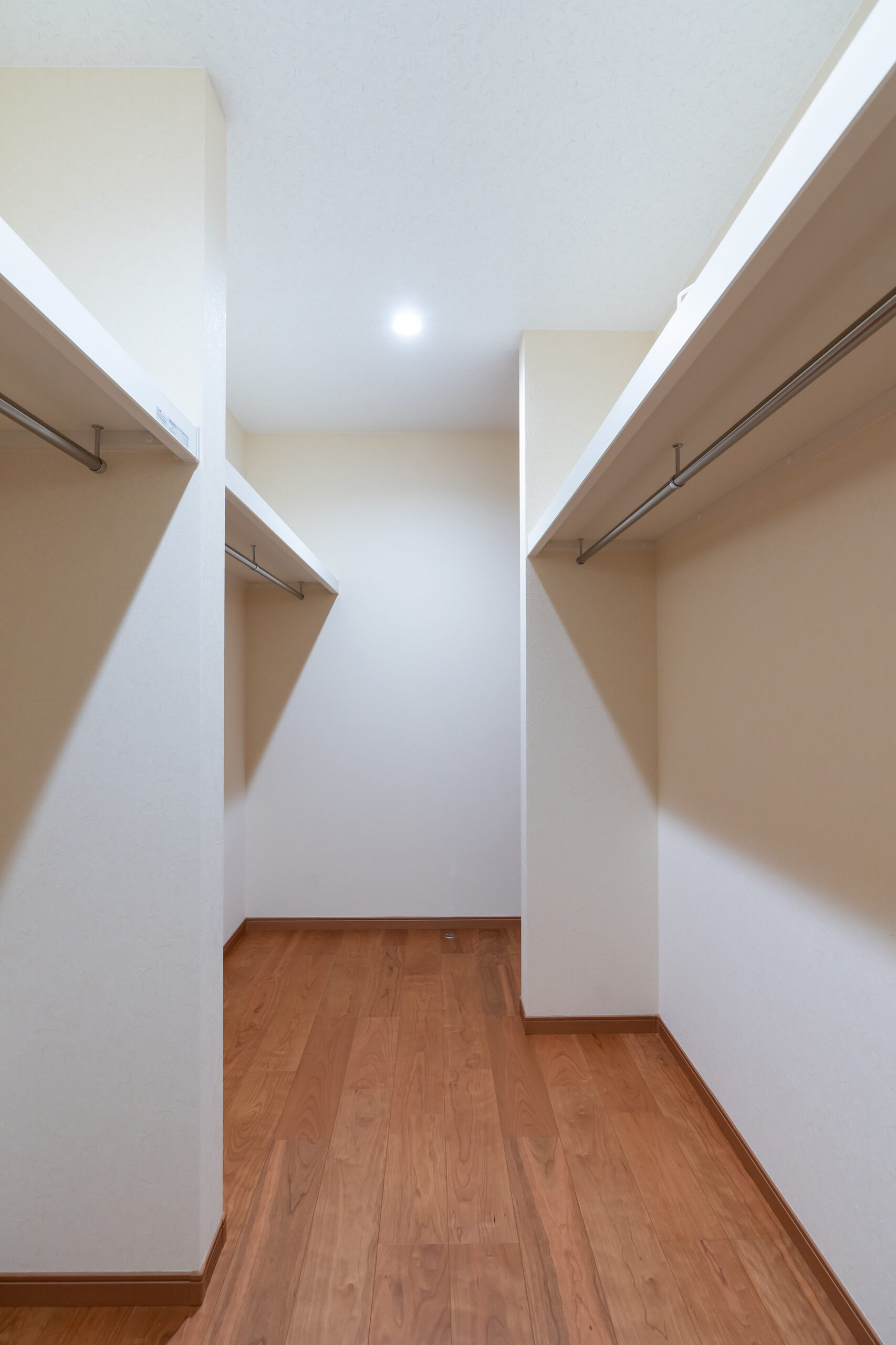 収納たっぷりのお家ですので、随所にウォークインクローゼット(オープンタイプを含む)が。用途に合わせてたくさんの収納が可能になります。これからお好きなコレクションが並ぶスペースにもなる場所です。