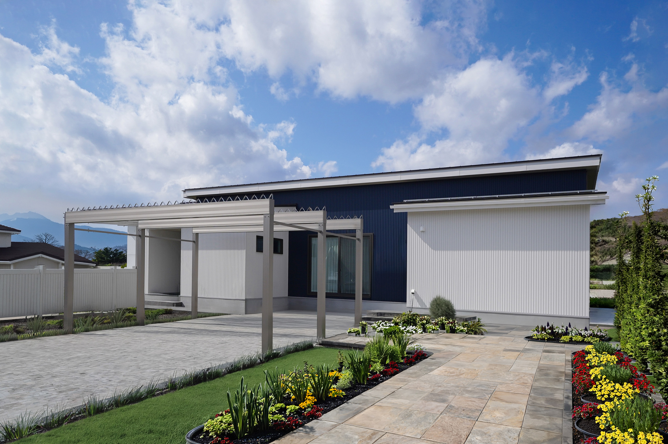 澄み渡る青空を切り取ったようなネイビーと、潔いホワイト。水平ラインが美しい平屋のフォルムは、まるで一枚の絵画のように風景に馴染みます。「ただいま」と帰ってくるたびに、自分の家が一番かっこいいと思える。そんな誇りと愛着を感じさせてくれる、色褪せないデザインのHIRAYAです。