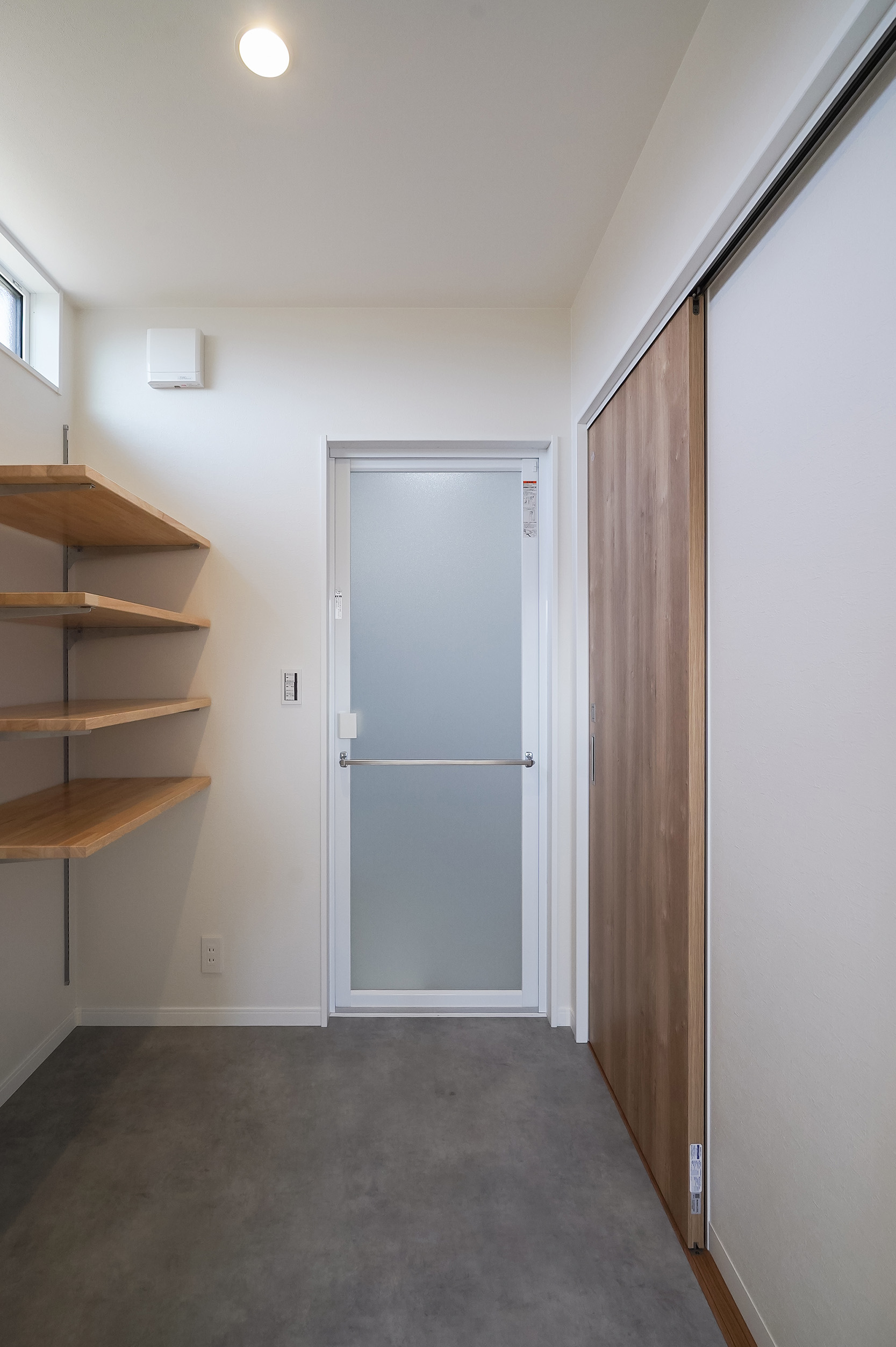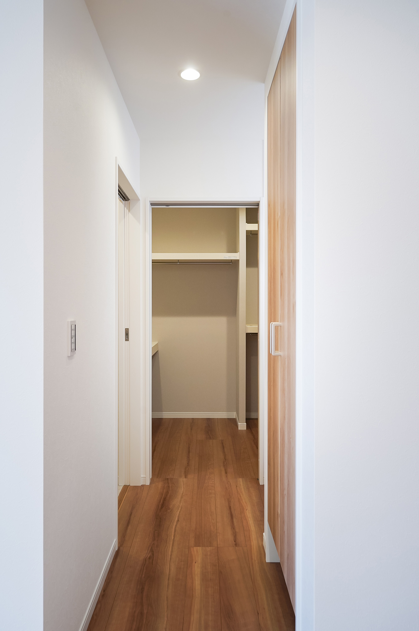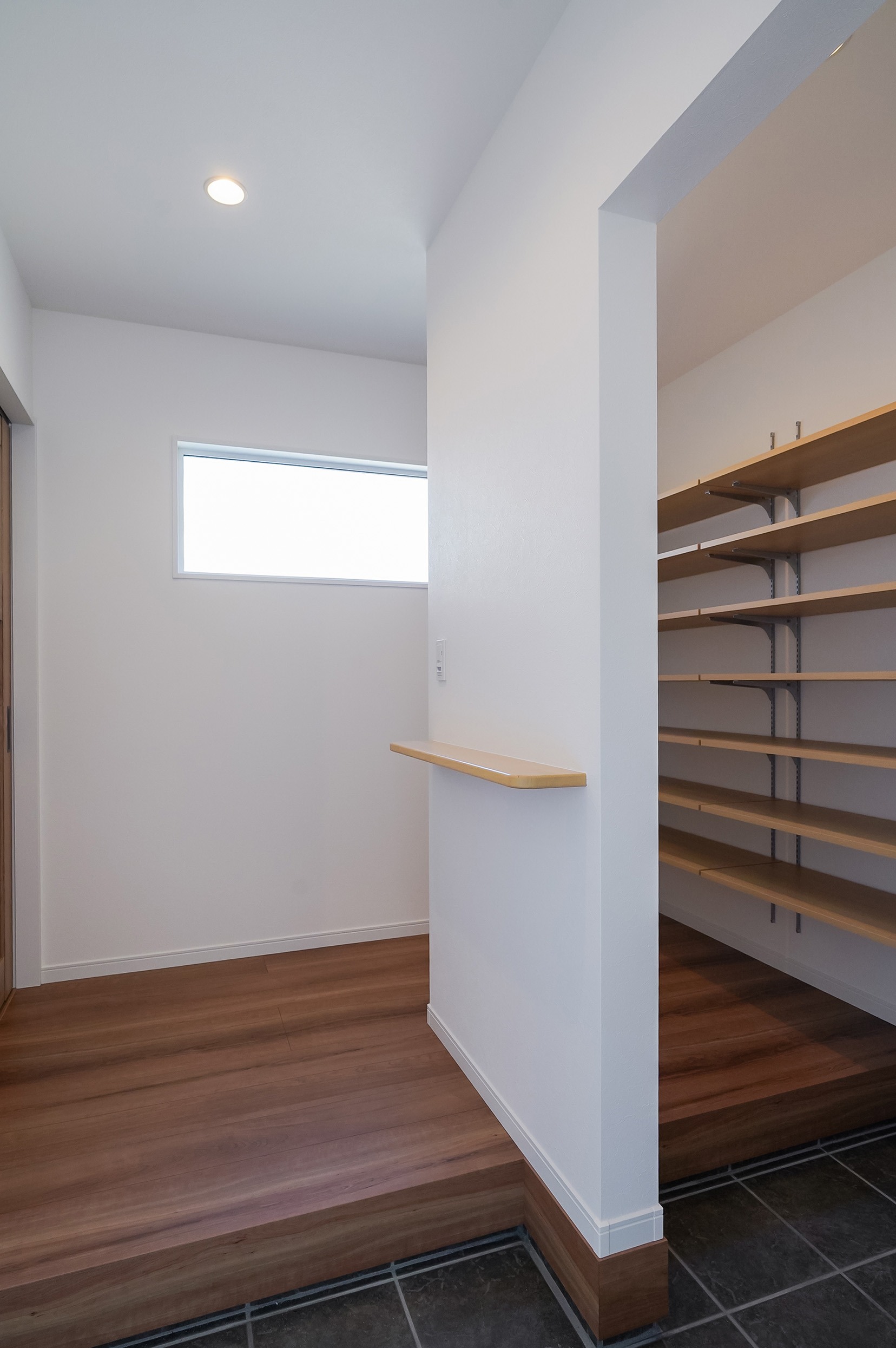 玄関を入った瞬間の開放感。それを支えるのは、たっぷりとした土間収納です。外で使う道具や靴をここで脱ぎ捨て、一歩中へ。さらに廊下の突き当りには、家中の「日常」を丸ごと受け止めるウォークイン収納を配置しました。「玄関で脱ぎ、突き当りで仕まう」この自然な流れがあるからこそ、リビングには余計なものが持ち込まれず、家族がくつろぐ空間はいつもスッキリと澄んだ状態に。