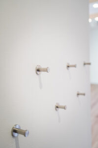 白い壁に、リズミカルに並んだ小さなステンレスの収納フック。これは、生活の余白を楽しむための遊び心。お気に入りのストール、旅先で見つけたトートバッグ、あるいは季節のグリーンを吊るして。その日の気分に合わせて「お気に入り」を掛け替えれば、白い壁は、あなたの人生を映し出す小さなギャラリーに。このお家には、そんな小さなときめきを見つける場所があります。